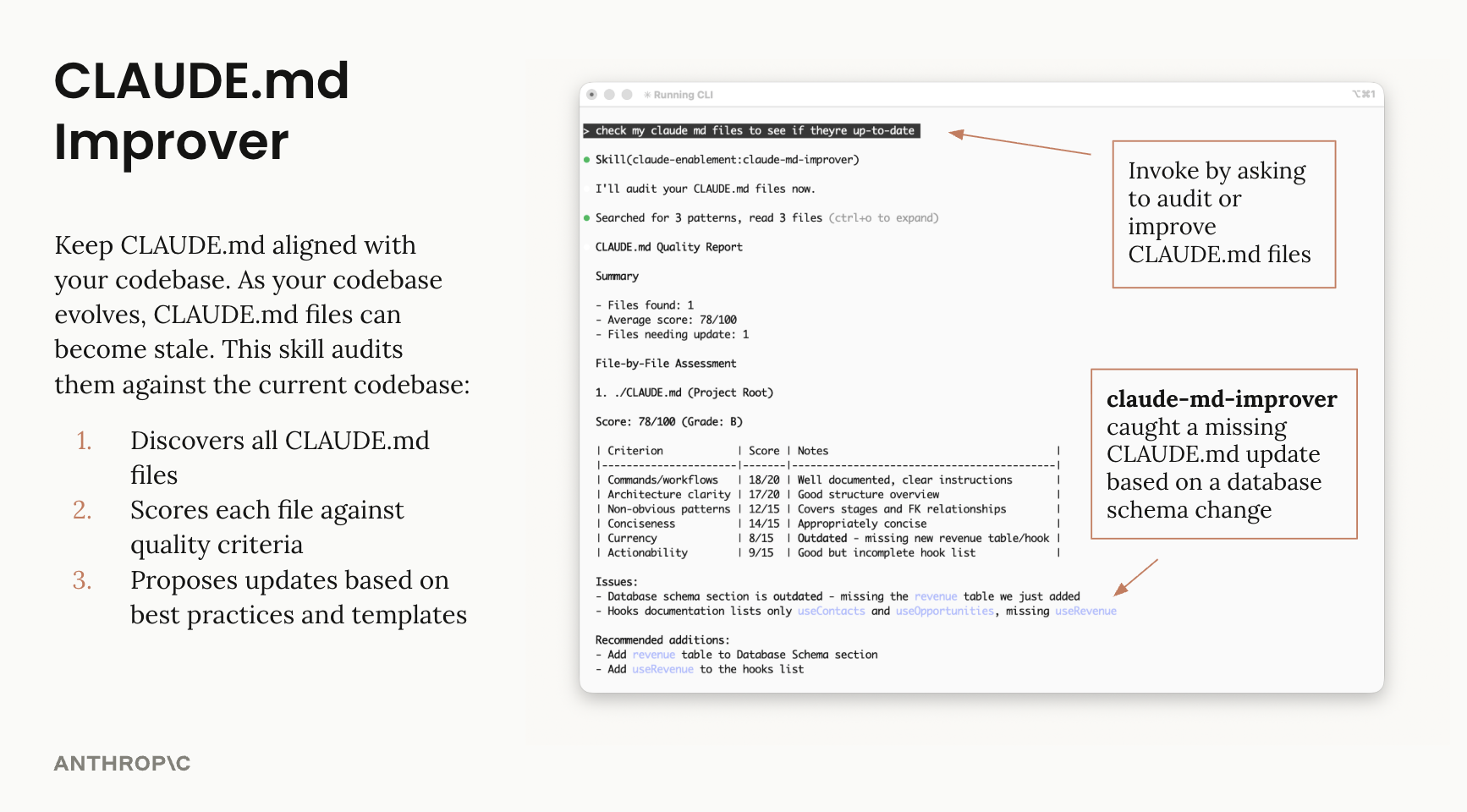 | claude-md-improver (skill) | /revise-claude-md (command) | |